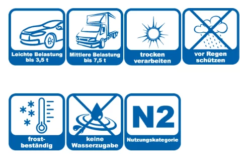 - Fläche nach 24 Stunden begehbar, nach 7 Tagen befahrbar (bei +20°C Temperatur und 65 % rLF)